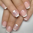 For et aftenudseende kan du vælge en løsning med slør accenter. Hvis du ønsker at blive på fransk, skal smilet laves i form af en tynd konturlinie, så det ser mere elegant ud. En uigennemsigtig fransk jakke med et foliesmil kan dekorere et aftenantøj. I dette tilfælde vil lakens matte satinstruktur se smukkere ud.