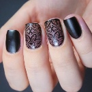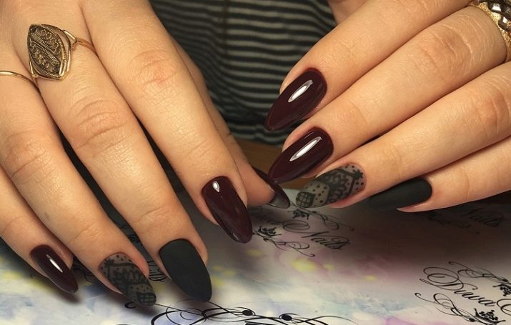 For eksempel kan du lave hovedbaggrunden i form af en jakke med matlakering og satintekstur og gøre et smil glansfuldt. Alternativt kan blonder, der er accenteret med glans på en accentnagel, blive accenten til et sådant design.