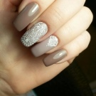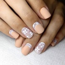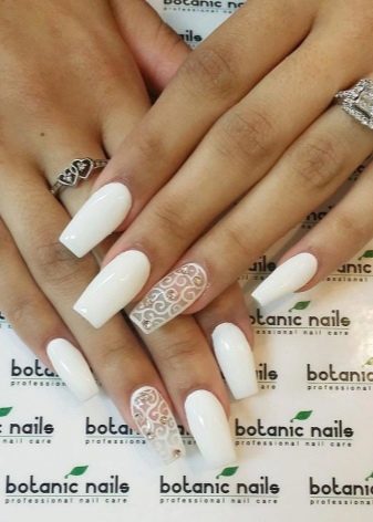 Glanslaker er velegnet til elegant bryllupsdesign, akrylpulver er godt, og gnidning ser også godt ud. Især forsigtigt på den hvide belægning ser perlestøv ud, hvilket ændrer dens virkning afhængigt af tidspunktet for gnidning af dekorativt materiale. Farverne på en sådan manikyr kan bleges, mynte, karamel, lyserød. Volumetriske monogrammer oprettet på accenter af hvidt akrylpulver vil se smukke ud i en sådan manikyr.