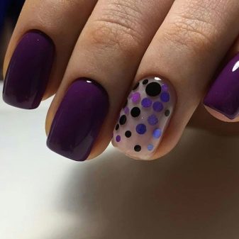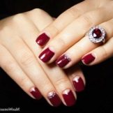 Han vil være i stand til at afslutte sætet til offentliggørelse tilstrækkeligt til at dekorere neglene på ventilatoren af dekorationen. Ofte bruges ofte klassisk farvning af negle med en farve i en kombineret manikyr.
