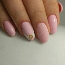 For at sættet skal passe ind i rammen af dress code eller hverdagsklædning, skal du starte fra to regler: tilbageholdenhed og koncis. Dette betyder dog ikke, at du skal nægte dig selv valget af en smuk lak. Overhovedet ikke: det kan og bør være specielt. I dette tilfælde kan du bruge endnu en farve, men en anden struktur. Mat fløjlsagtig manikyr uden billede, men med en accent foretaget ved at gnide, kan blive super-smuk.