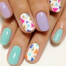 Foruden snørebånd er geometriske tryk populære prints af professionelle i studio. Først og fremmest er disse langstrakte trekanter, der strækker sig fra sømbunnen til dens kant. På grund af den aflange form skabes effekten af sømmen og hændernes elegance. Trekanter i dag betragtes som et trendy print, de bruges i forskellige manikurteknikker.
