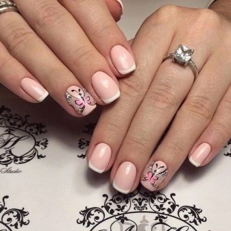 Hvis du vil have mere kendte løsninger, kan du foretrække en servicejakke med et subtilt smil. Samtidig kan du på alle negle, undtagen accenten, give et lakonisk smil, og på accentpladen gøre det, for eksempel blonder eller i form af et blomsterblad.