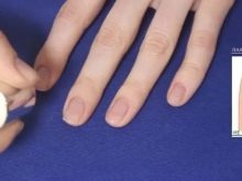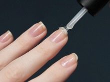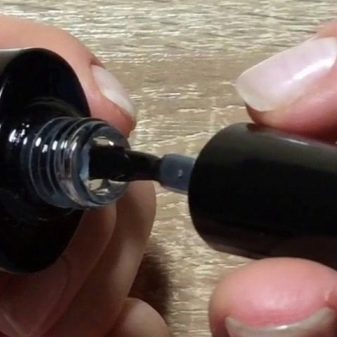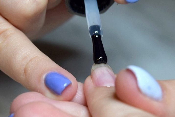 - Det er nødvendigt at påføre det første lag så tyndt som muligt. På basen, som på børstens spids, skal flere midler fjernes, så der ikke er meget tilbage på selve børsten. Derefter kan du fortsætte med at gnide basen ned i neglepladen.