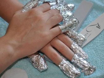 Det er vigtigt at fjerne den gamle lak korrekt. Hvis dette sker uafhængigt og derhjemme, kan du ikke rive det af negle eller plukke det med metalgenstande. Der er specielle gelpoleringsfjernere, der hjælper med at fremskynde denne proces. Den bomuldsuld, der er gennemvædet i opløsningen, påføres lakken, indpakket med folie og efterlades i denne form i 20 minutter. Efter denne tid behøver gelpolitikken kun fjernes omhyggeligt med en orange pind.