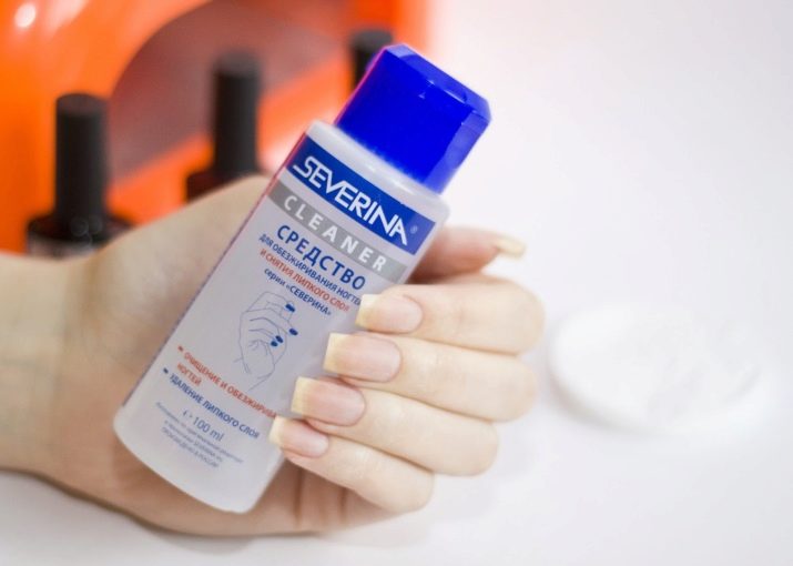 Det er bedre at bruge en universel specialiseret sammensætning til at forberede negle til shellak. Fordi ikke enhver komposition er egnet til dette formål. Der er specialiserede affedtningsmidler til gel-, biogel- og acrylforlængelser.