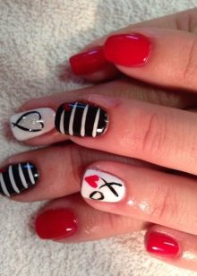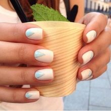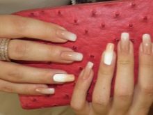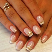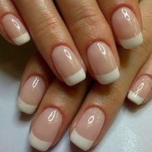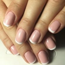 - Fransk manikyr. Fransk er også relevant denne sæson. Du har brug for shellak i nøgen nuancer og hvid. Oprindeligt tilberedes negle i henhold til ovenstående skema. Derefter påføres basen, den valgte nuance. Hvert lag polymeriseres. Så skal du bruge den hvide farve til at tegne en linje med et smil. Du kan bruge forskellige andre farveindstillinger, der udtrykker en moderigtig manikyr. Nu er det vigtigt at lave en smilelinie i geometriske former.