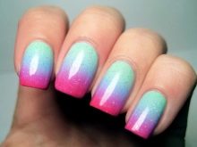 - Ombre. Denne manikyr repræsenterer en glat overgang fra en skygge til en anden. Gør det temmelig enkelt. Det er nok at vælge farveskemaet for shellak og anvende det på neglepladen. Brug en blæserformet børste og blend forsigtigt grænserne på skyggerne. Du kan også tage et stykke folie og lægge det ved siden af det to dråber shellak i forskellige farver. Brug en tandstikker til at blande tonerne på kontaktpunktet. Tag derefter en svamp, dypp den i shellak og overfør alt til overfladen af neglepladen. Bevægelser skal være tydelige og selvsikre. Gentag processen flere gange for at få mættede farver. Derefter polymeriseres laget, og et toplag påføres ovenpå.
