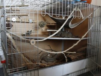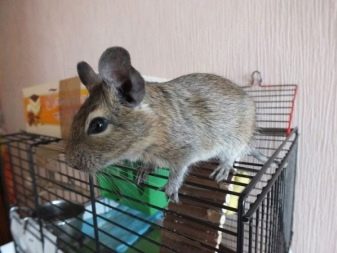 Det frie bur skal være udstyret med en hård bund. Det skal være dækket med chips. Der skal være en skål med mad, en flaske vand. Mad til dit dyr kan vælges fra foder til marsvin eller pellets til chinchillaer. Arrangementet af cellen inkluderer ikke kun vigtige ting til klatring eller fodring, obligatorisk er eksistensen af genstande, som degu vil kneble.