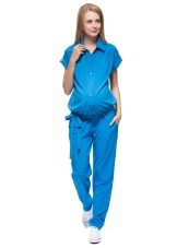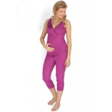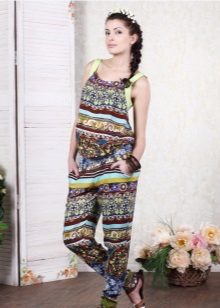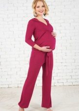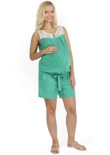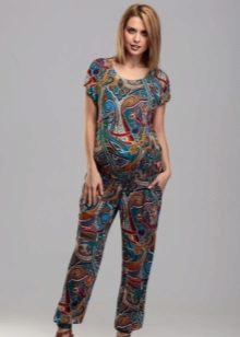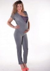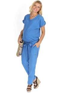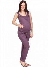 Denne jumpsuit kan bruges efter graviditet. Toppen, lavet i form af en T-shirt, giver mor mulighed for komfortabelt at fodre babyen. På grund af farven ser den stilfuld og interessant ud.