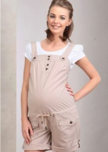 DFor varmen foretrækker fremtidige mødre mini-overalls. Ser ud til lave shorts. Maven understøttes også af en strækningsstrimmel. Den øverste del er fastgjort af fastgørelseselementer på et bælte og løsnes. Så er der kun shorts.
