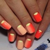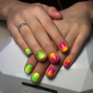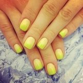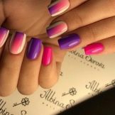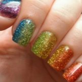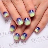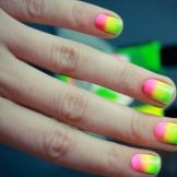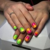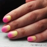 Dette hit de seneste år ser godt ud på enhver længde af negle og når som helst på året. Om sommeren ser denne glatte overgang fra en skygge til en anden dog særligt passende ud. Den ombre teknik og gradient er lige så god til beskårne negleplader. Den naturlige palet med varme toner er mere efterspurgt om sommeren. Korrekt valgte farver forkorter ikke neglene visuelt. Det er bedre at foretrække en lodret gradient. Særlig opmærksomhed om sommeren skal der gives regnbuehældning, som giver dig mulighed for at kombinere lyse, rige farver.