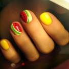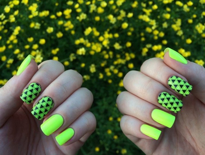 På trods af det faktum, at for lyse nuancer ikke altid passer til korte negle, er sommerdesign svært at forestille sig uden dem. Saftige, iørefaldende nuancer er perfekte til sommeren, så du kan vælge frugt, neon, solrige nuancer. Lys design i geometrisk stil er meget god, men det er bedre at nægte for udtryksfuld indretning for ikke at overbelaste kompositionen.