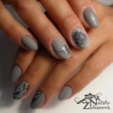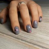 Dette er ikke den nemmeste farve for neglekunst, men den giver ikke plads til forkant inden for mode. Populariteten af den grå skala kan let forklares med dens tilbageholdenhed, upåvirkning, sofistikering. Det ser godt ud i forskellige designmuligheder, passer godt med andre nuancer, passer perfekt til ethvert, selv det mest strenge, billede. På korte negle ser han særlig elegant og pæn ud.
