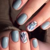 Fans af diskret design bør ikke opgive blomstermotiver, da blomsterarrangementet kan laves i en minimalistisk stil. Enhver baggrund i pastelfarver og den eneste tynde stilk med en blomst på en aksentfinger er både elegant, sofistikeret og meget smukt ensemble. Blomstertemaet er også godt, fordi det perfekt kombineres med forskellige teknikker: Fransk og månemanikyr, gradient, glitter.