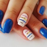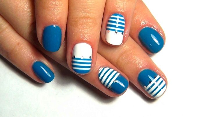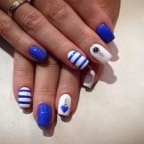 En anden populær sommerdestination, der skaber stemningen for ferier, hvile, frihed. Udført marine manikyr i blå og hvide klassiske toner. Her vil strimler, bølger, tegninger i form af måger, ankre, andet skibsudstyr være passende.