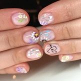 Pastell gamma er et ideelt valg til korte negle, især hvis fingrene ikke er forskellige i nåde og længe. Pastellserien er også en fantastisk løsning til luftigt sommerdesign. Mangfoldigheden af mulighederne for denne farvetonalitet er meget stor. Pastel er ikke kun fersken, fløde, nøgen, beige kødtoner. Dette er en delikat mynte, subtil blå, udsøgt lavendel, elegant rose. Næsten hver palet har en pastelskygge, og alle af dem vil være meget gode til sommerdesign på korte negle. En åbenlys fordel ved pastellen er, at det takket være sin fastholdelse giver dig mulighed for at bruge absolut enhver indretning.