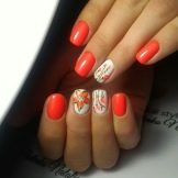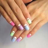 Om sommeren kan du lege med indstillingerne: at designe en kant og et hul med iørefaldende kontrastfarver, hvilket giver basen uberørt. Den perfekte løsning til sommeren er farvede armbånd, prikdesign, brudt glasindretning. Du kan også designe negle ved hjælp af moderigtige geometriske former: trekanter, cirkler, firkanter. Næsten ethvert farveområde er acceptabelt; om sommeren ser et hvidt negativt design og kompositioner med guld, sølv og farvet glitter meget frisk og interessant ud.