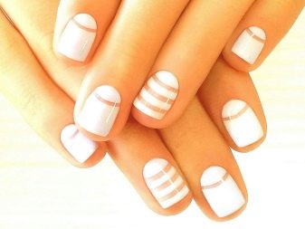 Ekstremt populær type neutral design foretrækkes af fans af minimalisme og dem, der er i tæt ramme for en streng dress code. Negativ design betyder, at en del af pladen er intakt. Du kan bruge denne teknik ikke kun i fransk og månedesign, men også til det halve. Dets åbenlyse plus er praktisk, for hvis der efterlades negativ plads i slutningen af neglebedet, kan korrektion kun udføres, når du vil ændre designet.