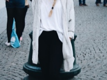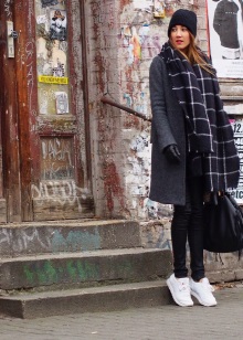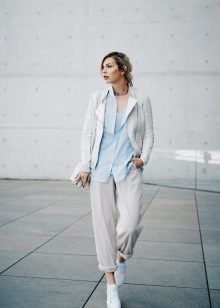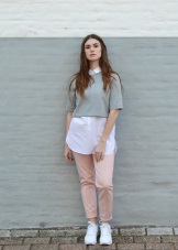 Bær hvide sneakers med brede beige kjole bukser. For et efterårssyn skal du tilføje en pastelfarve og en levende taske. Du kan bære sneakers med culottes. Reglerne er næsten de samme som når du bærer dem med midi. I denne stil ser du enkel ud, men smagfuld ud.