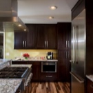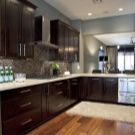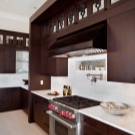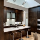 Billedet viser et strålende rent brunt køkkeninteriør. De meget mørke møbelfasader kontrasterer fint med mosaikforklædningsafslutningen. Rationelt anvendte og spejleoverflader.