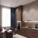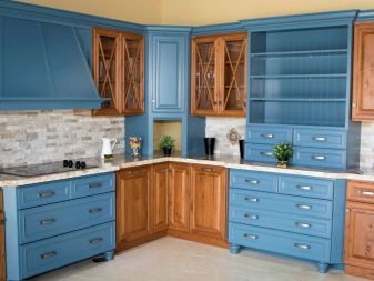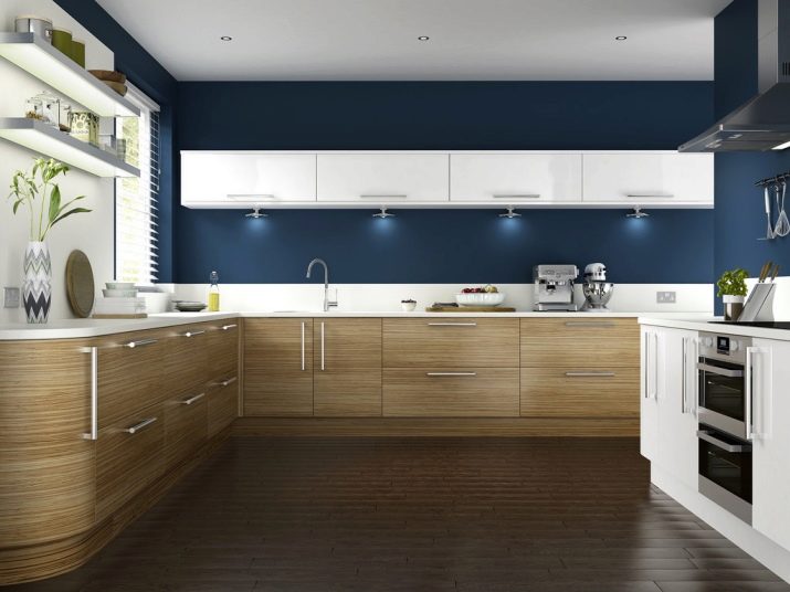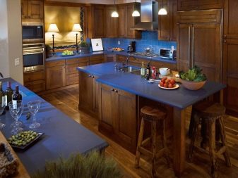 Efterspørgslen er kendetegnet ved en blåbrun variation af køkken. Du kan forestille dig denne kombination af toner på forskellige måder. Både de blå og brune dele er let mættede eller fortyndede. En sådan løsning vil se lettere, mere sofistikeret og mere elegant ud. Når en af farverne vælges som den dominerende, skal du tage hensyn til arten af det visuelle komplement og forholdet. Og når blå og brune farver er ens, er det påkrævet at sikre en harmonisk overgang mellem dem. Ellers kan det se ud til, at pladsen er overbelastet. Fordelene ved det blåbrune sortiment er: