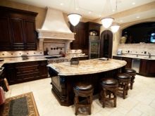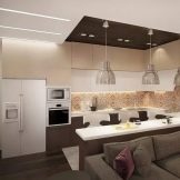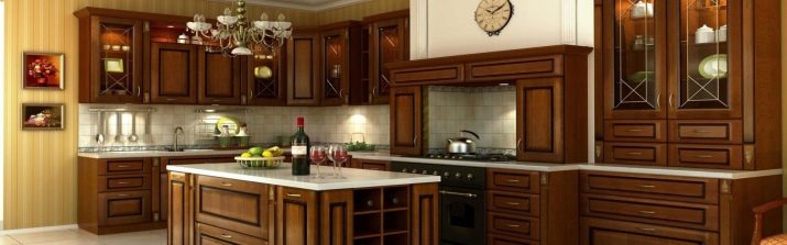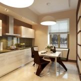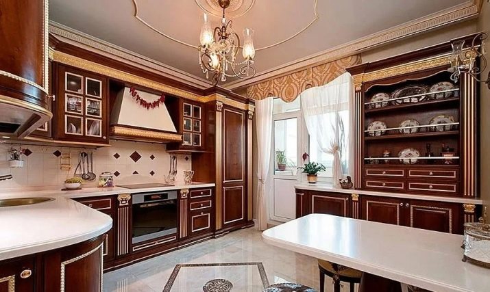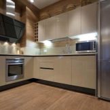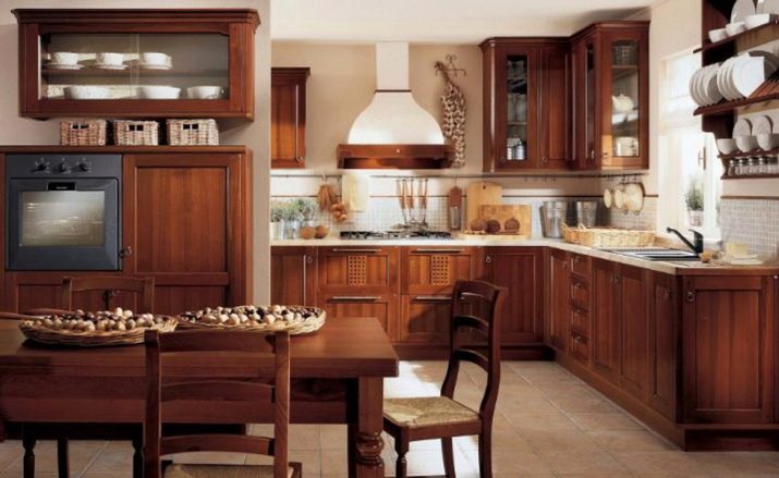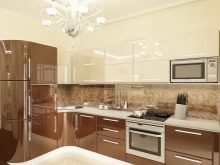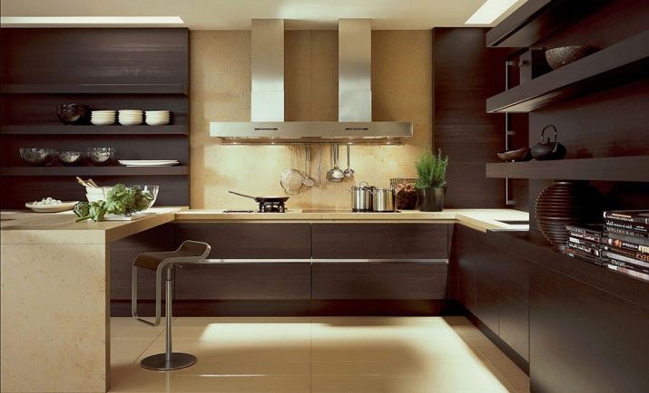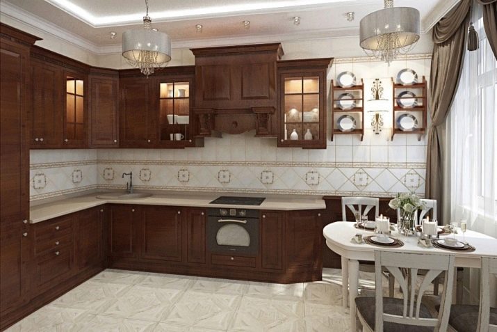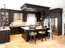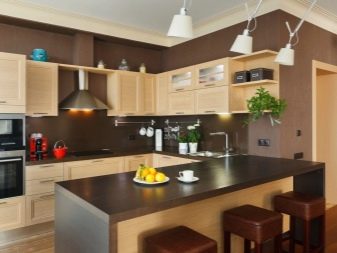 Når rummet er ret stort, og belysningen er meget god, er mørkebrune farver tilladt. I denne version af interiøret er det logisk at bruge naturligt træ og understregede dyre tekstiler.Men fortynding af beige-brunt køkken med andre nuancer er uberettiget. På grund af dette kan den iboende elegance af en sådan løsning blive forringet.