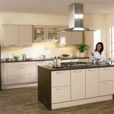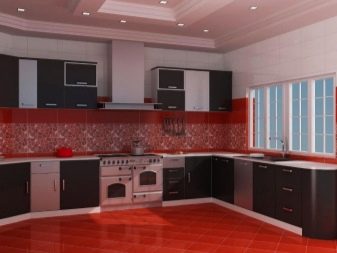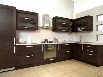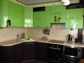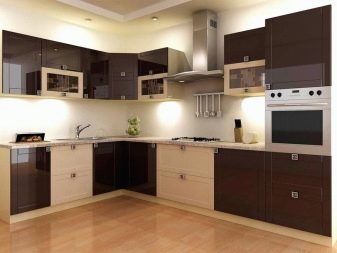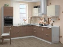 Den L-formede type headset betragtes normalt som universel, men det vil være mest optimalt i moderat store rum. Ergonomi i hjørnelayoutet kommer til udtryk i, at det let giver dig mulighed for nemt at oprette en fuldt fungerende trekant. Installation af alt det nødvendige husholdningsudstyr medfører ikke problemer. I meget store, som i meget smalle værelser, er sådanne løsninger imidlertid næppe praktiske.