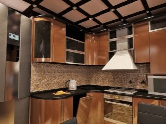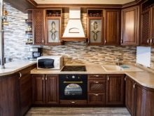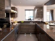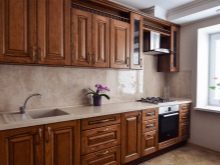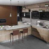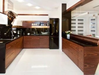Brunt køkken kan være U-formet. I dette tilfælde fordeles hele mængden af møbler og apparater langs tre vægge. Men konfigurationen i form af bogstavet "P" er uegnet til beskedne eller meget store værelser.