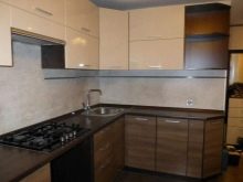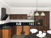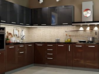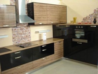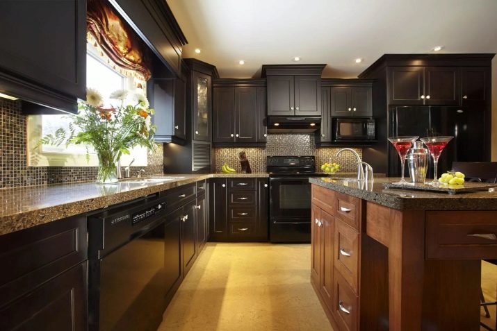 Brune facader kan let kombineres med sorte bordplader. I dette tilfælde kræves der lyse farver til at dekorere vægge, forklæde og gulv. En alternativ opløsning involverer en sort nedre, brun øverste strimmel, fortyndet med en lys baggrund. Nogle gange bruger de sorte, blanke møbler, som er gunstig skygge af en lysebrun baggrund.