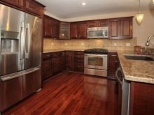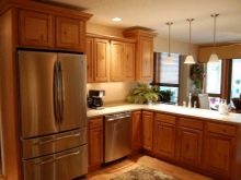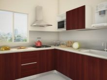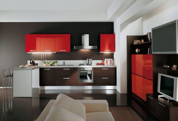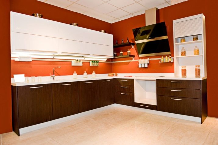 Gennemgå gennemgangen af muligheder, der passer til den rødbrune række køkkener. Dette er en relativt mild opløsning, der ikke adskiller sig i særlig fangst. Dette layout er perfekt til Provence- og Loft-stilarter. Metaloverflader anbefales. Matt skimmer foretrækkes fremfor glans. Det anbefales at medtage i det indre: