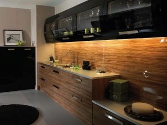 I mere moderne interiører er det passende at bruge strimler af forskellig art til dekoration af et brunt køkken. I de tidlige 2010'ere blev det antaget, at det stribede indre var forældet. Nu er denne stilistiske beslutning nu under en renæssance. Strimler er især gode i en monoton indstilling, hvor de giver dig mulighed for at gøre udseendet mere elegant. Striper kan blive en pryd ikke kun af vægge, men også af møbler, dekorative genstande. På væggene er de passende i stilarter som: