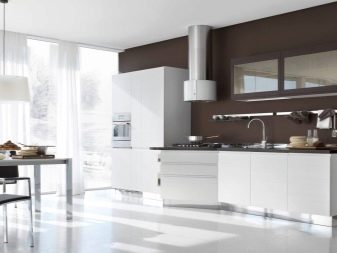 Men du kan se på køkkener med andre farver, inklusive hvid maling. Fusionen af hvide og brune toner åbner et væld af muligheder og giver dig mulighed for at gøre atmosfæren mere harmonisk. Hvid fratages overdreven aggressivitet, mens brun har mistet uberettiget tør praktisk. Derudover fjernes den visuelle reduktion af plads. Hvidbrunt rum er mest efterspurgt i moderne stilarter.