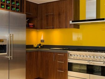 De bedste brune køleskabe imiterer naturligt træ. Nogle gange bruger de løsninger med brune møbler. Forklædet skal stå i kontrast til hende; i dette tilfælde hvid. Mørkebrune hovedtelefoner slå med gule, beige, undertiden røde forklæder. Det er også nødvendigt at overveje, hvad tapet på væggene skal stikke i rummet med brune møbler.