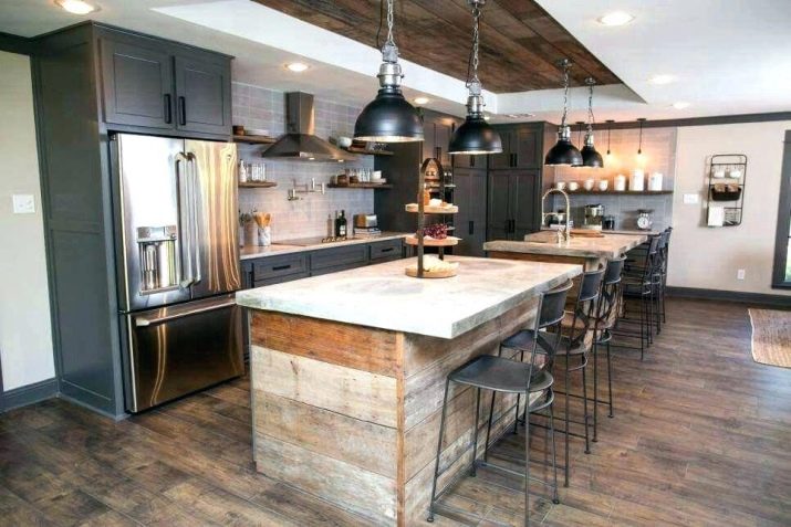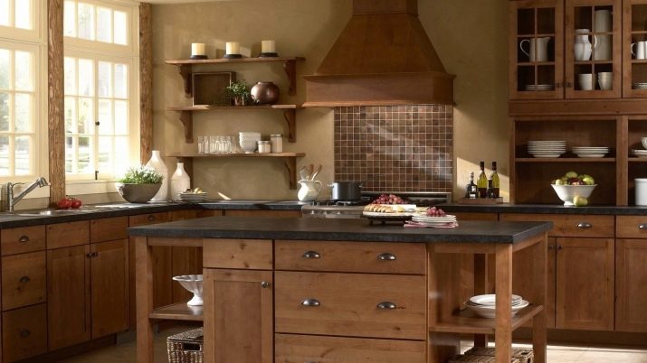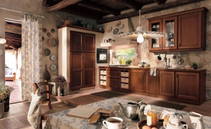 Moderne brune køkkener er ofte dekoreret i en gårdstil. Det gengiver en enkel og funktionel effekt, gør værelserne mere komfortable. Karakteristiske træk ved denne stil er: