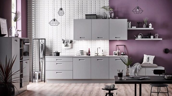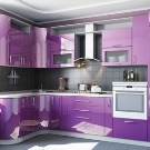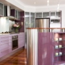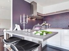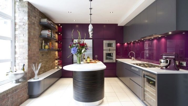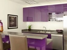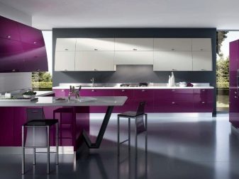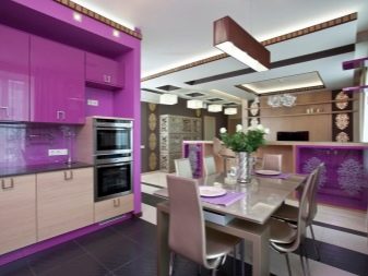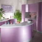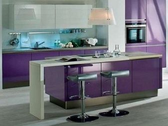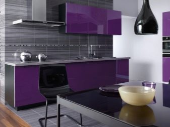 Designet af køkkenet i lilla toner involverer brugen af forskellige kombinationer. Nogle gange er det ganske vanskeligt at opnå den ønskede effekt på grund af tilstedeværelsen af både kolde og varme nuancer i indretningen. Af de mange nuancer af denne farve kan du finde en der er ideel til den ønskede mulighed under hensyntagen til køkkenets størrelse, dets møbler og tekstiler.