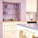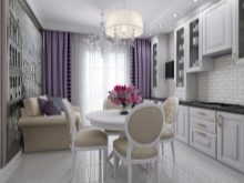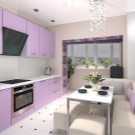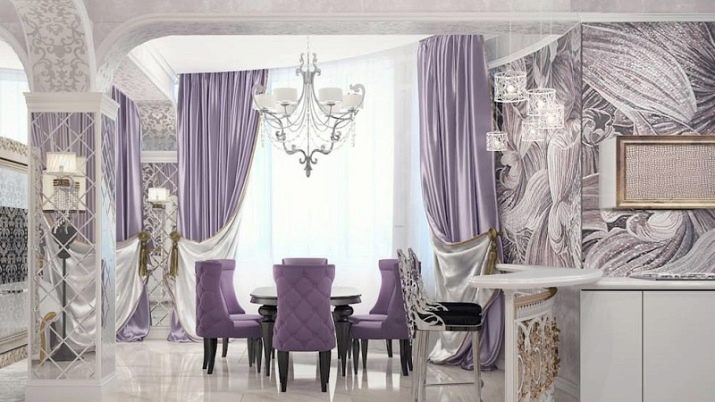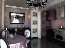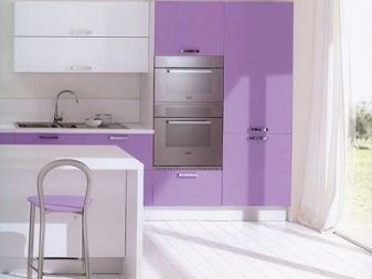 For et værelse i lilla toner anbefales det at vælge lette møbler. Glashylder og spejleoverflader i bløde lilla toner vil hjælpe med at gøre et lille køkken visuelt større. I dette tilfælde er det bedre at vælge strålende tilbehør.
