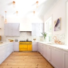 - En grøn tekøkken med lilla elementer ser usædvanlig ud. Det gul-syriske køkken ser også fed og frisk ud.