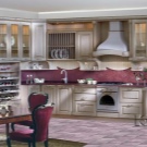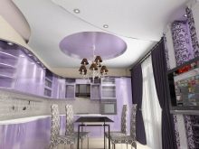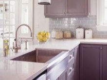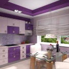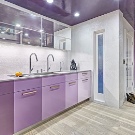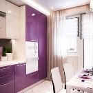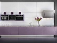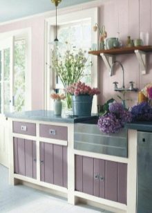 Et helt syrin køkken kan ses ekstremt sjældent, fordi denne farve visuelt reducerer rummet. Mere interessante og friske look-rum lavet i beige tone, men med brug af lilla accenter. Som farve accenter, gardiner eller et forklæde til køkkenrummet samt sæt i denne farve, lamper eller tallerkener i lilla toner, er egnede.