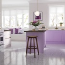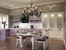 - For en ret rummelig plads skal du vælge en lys lilla, ametyst eller lilla skygge. Disse toner passer perfekt ind i interiøret. Tekstiler i bløde farver, polstring og små lamper giver køkkenet en hyggelig atmosfære.