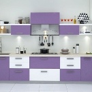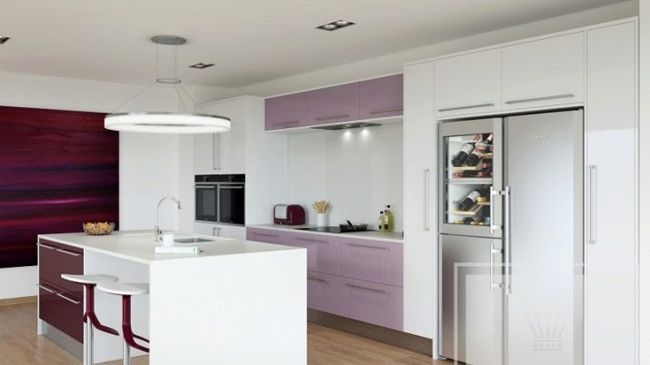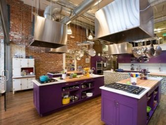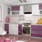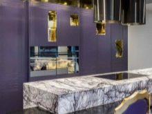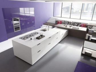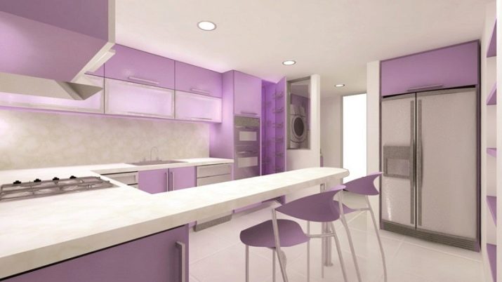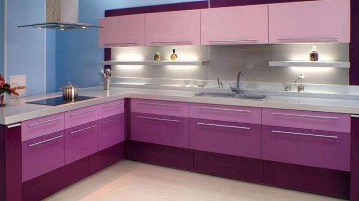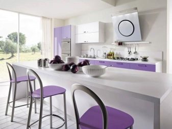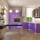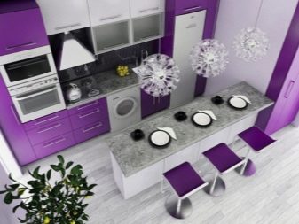Selvom denne farve i sig selv er ganske pompøs og kold, bruges dens nuancer ikke så sjældent i design. Helt lilla køkken er ikke almindeligt, du kan normalt se et design, hvor flere nuancer støder op. For at understrege farvemætning anvendes ledsagefarver.