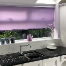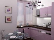 For at gøre køkkenrummet i lilla toner hyggeligt og behageligt skal du ikke overse rumets belysning. Hvis vinduet i køkkenet er lille, er det bedre ikke at hænge gardiner på dem, men at installere persienner. Et stort og rummeligt køkken passer med succes til en lysekrone i kombination med indbyggede lamper. Det vil være nyttigt at installere ekstra lys i arbejdsområdet.