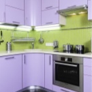 Forøg visuelt rummet og hjælpe hjørne køkken sæt. I et rummeligt lilla køkken er glans mere velegnet end den matte overflade på produkter. I et lille tekøkken i lyse farver vil et bord med en syrin bordplade placeret i midten af rummet organisk passe ind. Strukturens arbejdsoverflade skal være dekoreret i lignende farver.