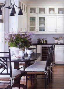 - Provence-stil Lilla nuancer er perfekte. For at dække væggene kan du vælge et tapet med et mønster i lignende farver. Det er vigtigt at kombinere detaljerne med hinanden. Hvis køkkenoverfladen er glat, er det værd at bruge tekstiler med et mønster, og vice versa. Kunstige alderen møbler supplerer interiøret.