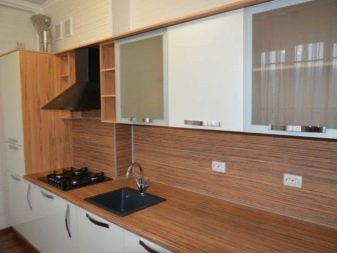 En sådan overlay er ekstremt smuk og tiltrækker opmærksomhed. I produktionsprocessen bruges et solidt array, så panelet er ret tungt. Dog har den en lang levetid, miljøvenlig, og det er muligt at gendanne. På samme tid anbefaler eksperter ikke at installere et falske træpaneler i køkkenet, da det under påvirkning af fugtigheds- og temperaturekstremer kan deformeres og endda kollapse.