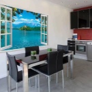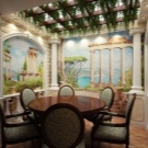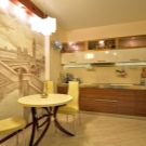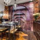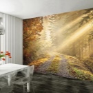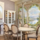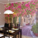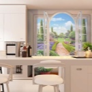 I et stort køkken fungerer modtagelsen af det såkaldte falske vindue perfekt. Gennem den kan du få udsigt over natbyen eller vandoverfladen i bugten med små lystbåde samt udsigt over de grønne bakker i den tidlige efterårsmorgen. Udsigten fra et sådant ”vindue” til de uendelige afstande hjælper med at glemme køkkenets virkelige parametre. Udvider et lille rum og et lyst billede med en perspektiveffekt. Det kan være en efterårsgade i parken om efteråret, en mørk skovsti, en smal bane i byen, en bred terrasse med udsigt over de omkringliggende omgivelser. Sådanne vægmalerier giver dig mulighed for at skabe illusionen om en gradvis tilbagegang og åben plads, denne slags dekoration kan kun udføres på en eller flere vægge på én gang. Opret et fototapet med et perspektiv på loftet eller på væggene, og denne effekt vil blive forbedret markant.