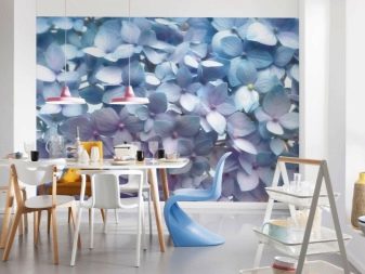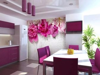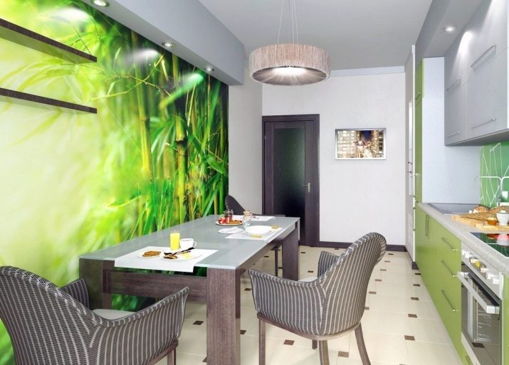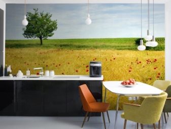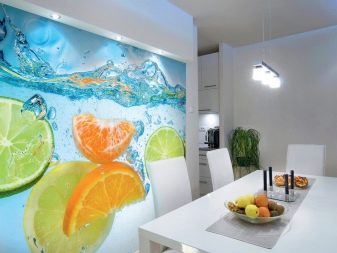 Størst af alt udvides køkkenets størrelse med tapetet med fotos i kølige farver, fordi designerne råder til små køkkener til at vælge produkter i grønlige eller blåblå farver. Når man vælger fotografier til køkkenet, skal man tage hensyn til graden af dets naturlige belysning. Jo svagere det er, jo lysere er det nødvendigt at vælge belægninger.