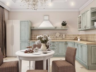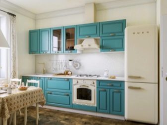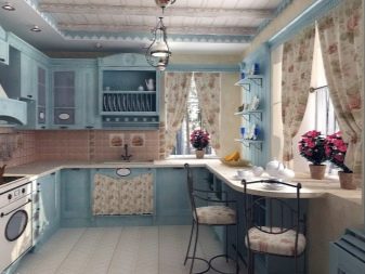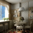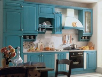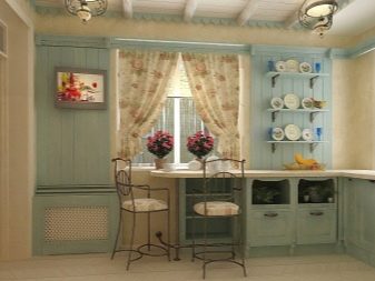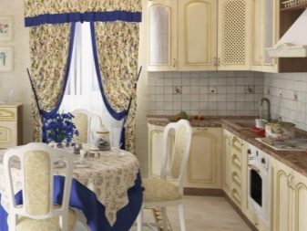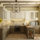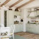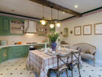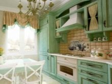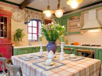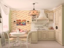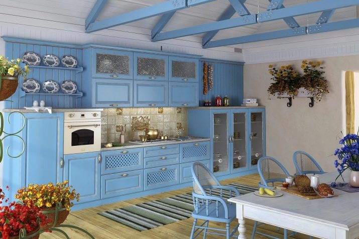 Kontrastfarver er et godt valg. Mørke bjælker og en lignende finish af lampeskærme og stole er perfekt kombineret med en beige eller grå base. Små provencalske køkkener forsøger at dekorere så lyst som muligt. Undertiden kan de farver, der adskiller separate møbler, gentages i andre interiørartikler. Hvide og turkise farver tilrådes at kombinere med store brune detaljer.