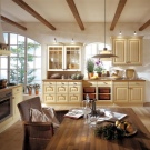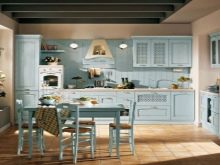 Når du har behandlet materialerne på køkkenets hovedoverflader, skal du gå videre til at overveje møbler, der passer til Provence-stil. Alle møbler, inklusive køkken sæt og stole, skal være lavet af naturligt træ. Kun med et begrænset budget kan du bruge strukturer lavet af spånplade eller MDF. Men man må forstå, at enhver sofistikeret person straks vil forstå - dette er ikke en rigtig provencalsk atmosfære. Headset kan males i følgende farver:
