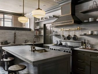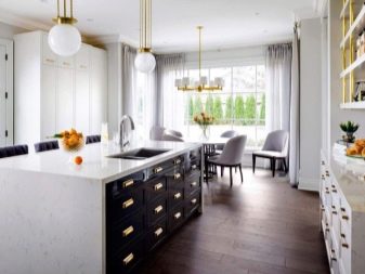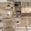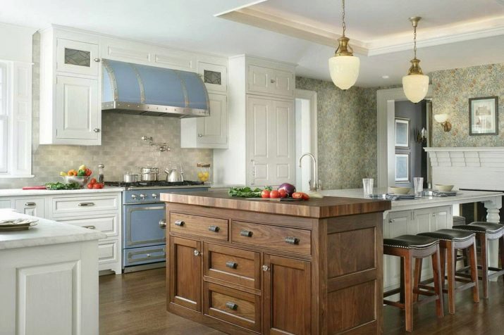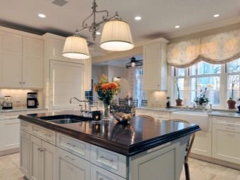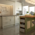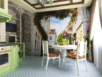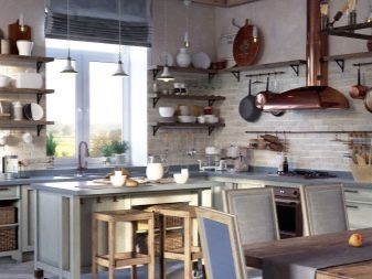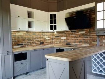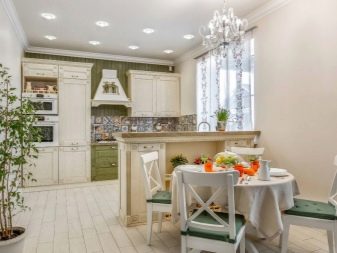 Et originalt trin i designet af et køkken i Provence-stil er at blande denne stil med loftelementer. Lofter og en del af væggene forsøger at male i forskellige nuancer af hvidt. På samme tid er den bedste demonstration af den industrielle stil murværk. For at forbinde to forskellige dele af rummet anbefales det at manipulere hvidt.